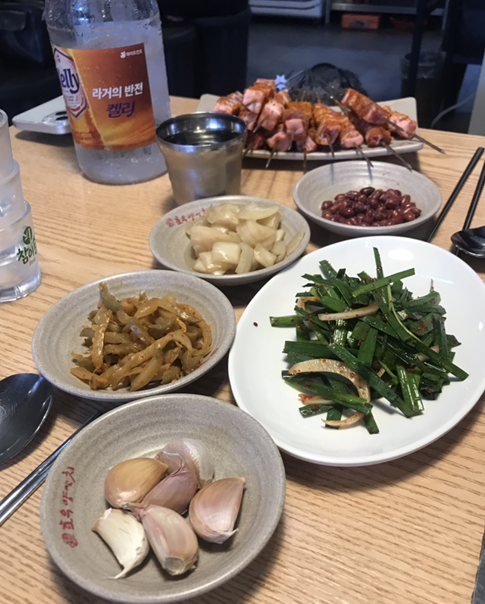 밑반찬과 양꼬치가 먼저 나왔습니다.