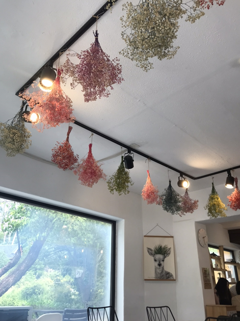 천장에 걸려있는 안개꽃이 형형색색입니다.