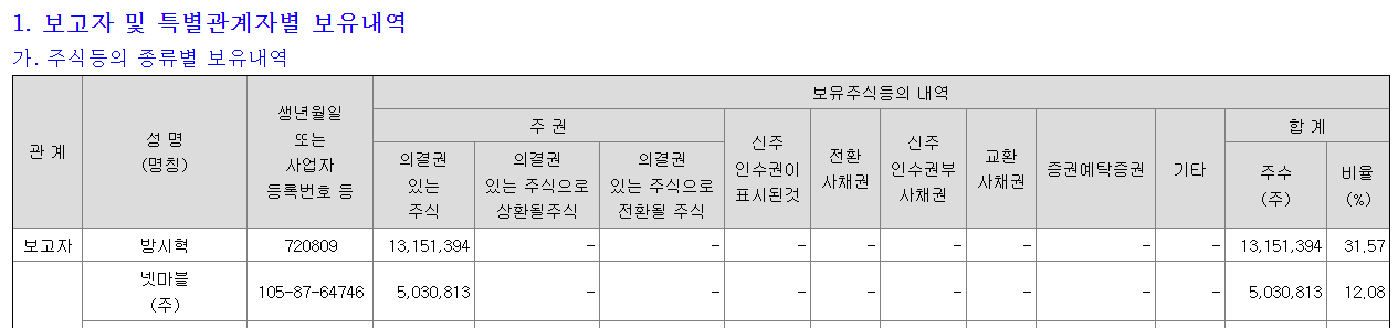 현재, 하이브 주식 13,151,394주를