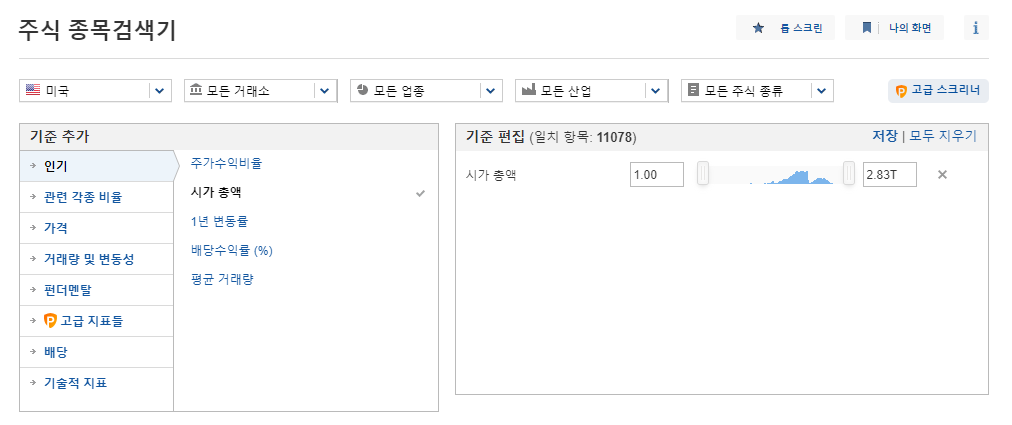 나라를 미국으로 선택하시고 시가 총액을 누르시면 됩니다.