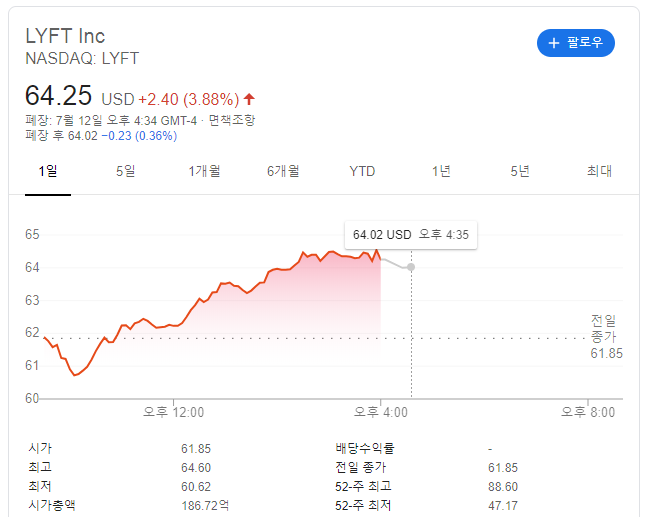 경쟁업체 리프트 또한 미국증시에 상장되어 있습니다.