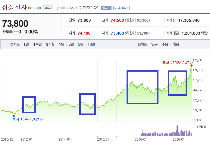 삼성전자의 10년 주가 그래프다.