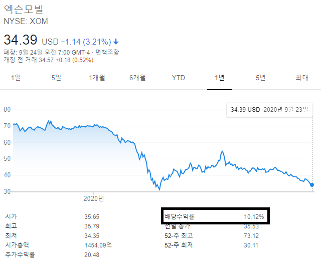 - 엑슨모빌 현재가 : 34.39 USD