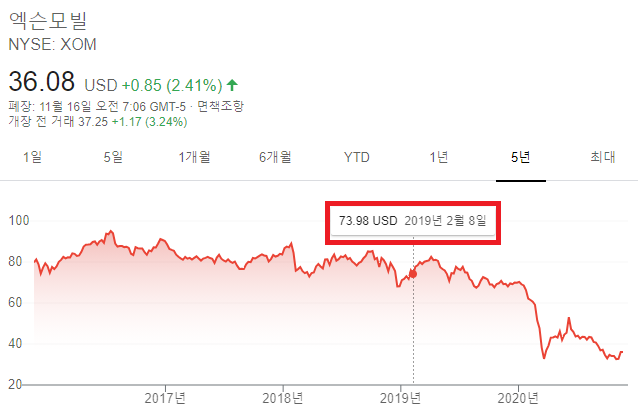 - 2020년 11월 16일 엑슨모빌 주가 : 36.08 USD