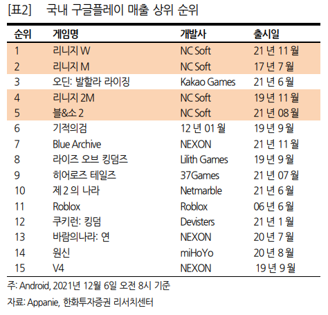 망했다는 블레이드 앤 소울 2가 구글플레이 매출 5위입니다.