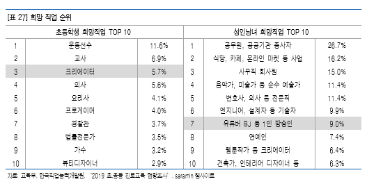 유튜브 크리에이터 1. 희망직업 순위