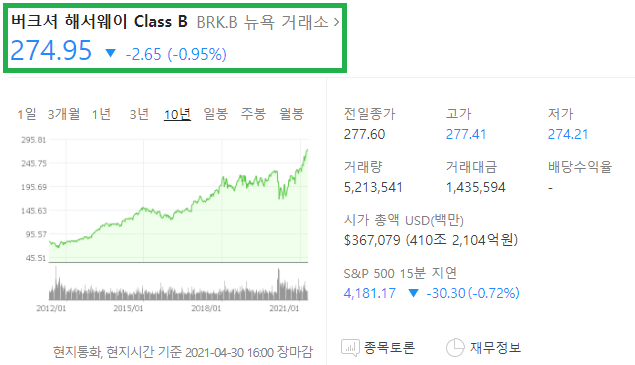 버크셔 해서웨이 클래스 B는 4월 30일 기준으로 274.95 달러입니다.