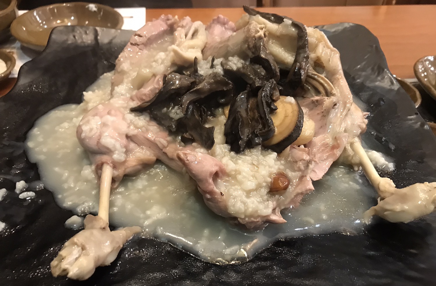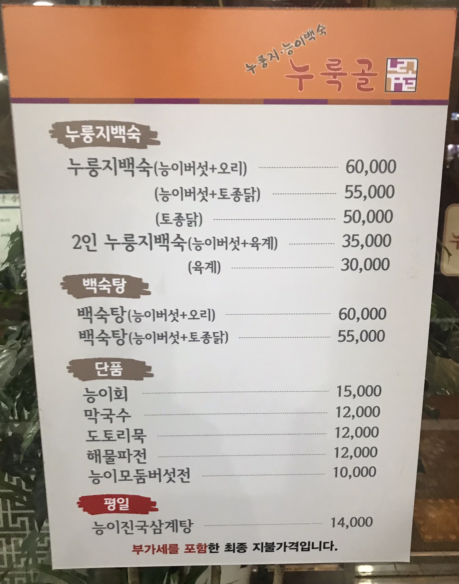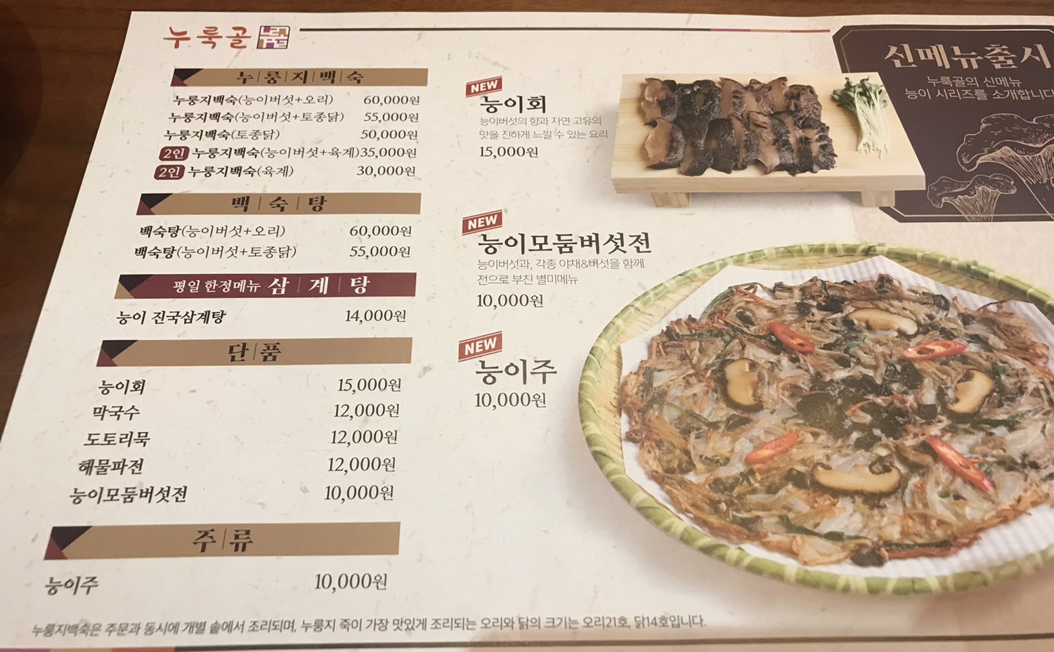 메인 메뉴인 누룽지 백숙(능이버섯+오리)을 주문했습니다.