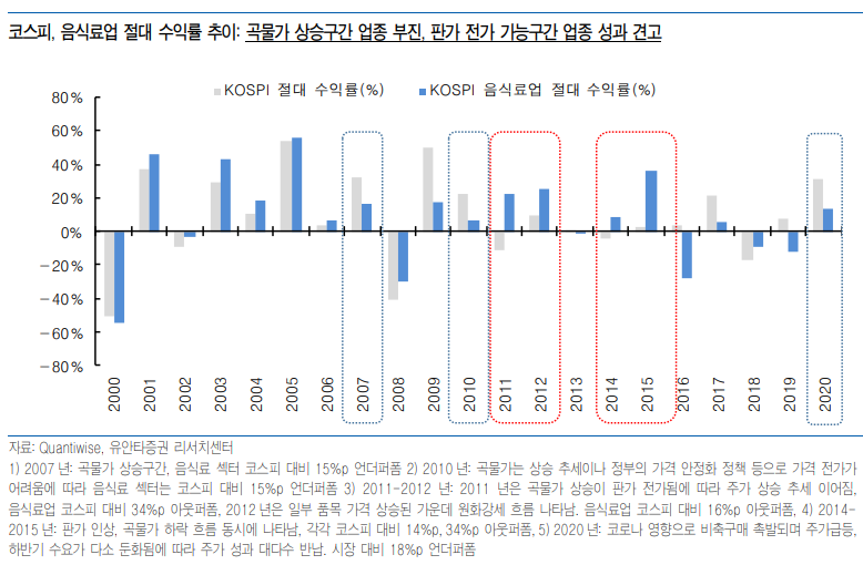 음식료 섹터는 곡물가 상승구간에서 지수 대비 언더퍼폼합니다.