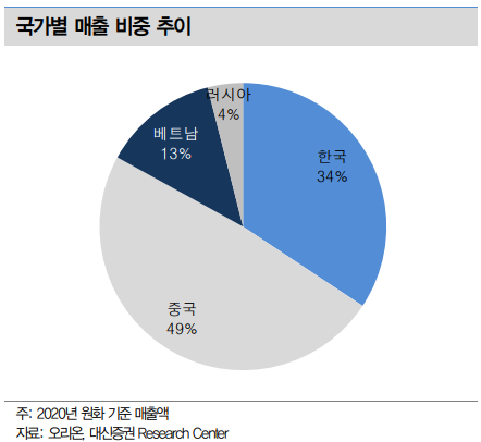 중국, 러시아, 베트남에 오리온 제품을 판매하고 있습니다.