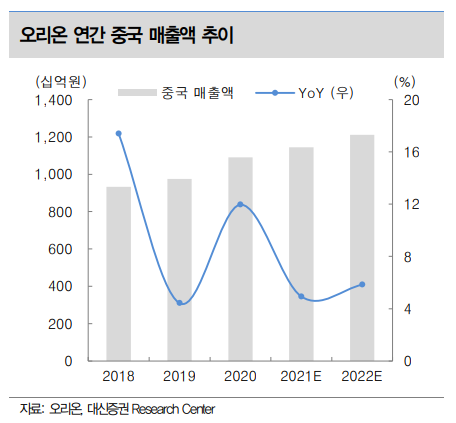 오리온의 중국 매출은 꾸준히 증가하고 있습니다.