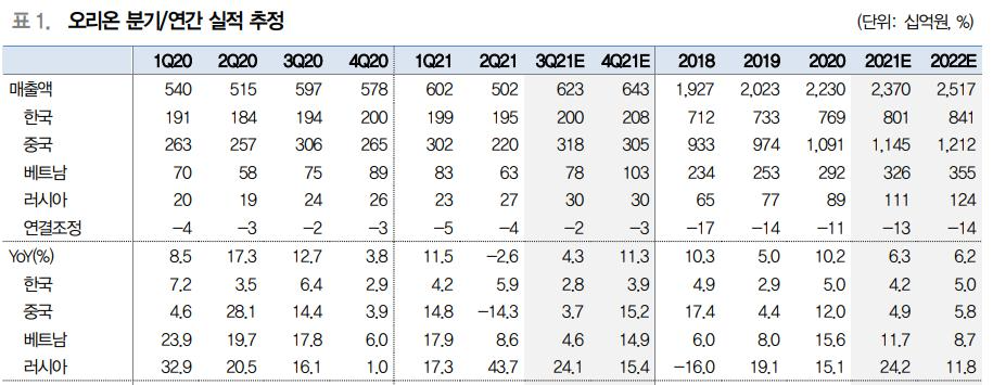 오리온의 중국 매출은 꾸준히 증가하고 있습니다.